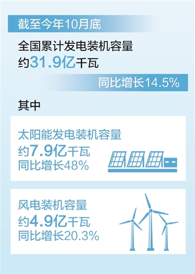 本报北京11月23日电 (记者丁怡婷)记者近日从国度动力局获悉:戒指本年10月底,世界累计发电装机容量约31.9亿千瓦,同比增长14.5%。其中,太阳能发电装机容量约7.9亿千瓦,同比增长48%;风电装机容量约4.9亿千瓦,同比增长20.3%。